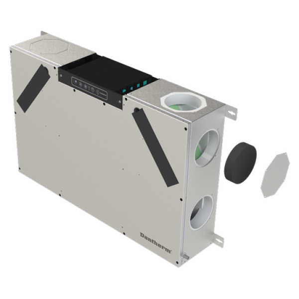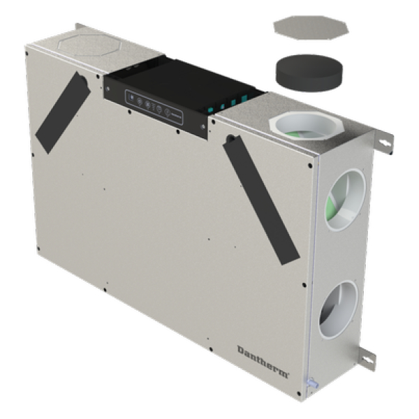 Centrální rekuperační jednotka Dantherm RCC 220 P2 je jedinečné a flexibilní řešení větrání obytných prostor. S výškou pouze 20 cm je ideální pro instalaci do stropních podhledů nebo na stěnu, dokonce i skrytou ve skříni. Jednotka je elektronicky reverzibilní. To umožňuje namontovat stejný typ jednotky s vnitřním/vnějším potrubím připojeným na pravou nebo levou stranu jednotky. Elektrické přípojky lze připojit zleva nebo zprava. Základní jednotka se dodává se zabudovaným ovládacím panelem.